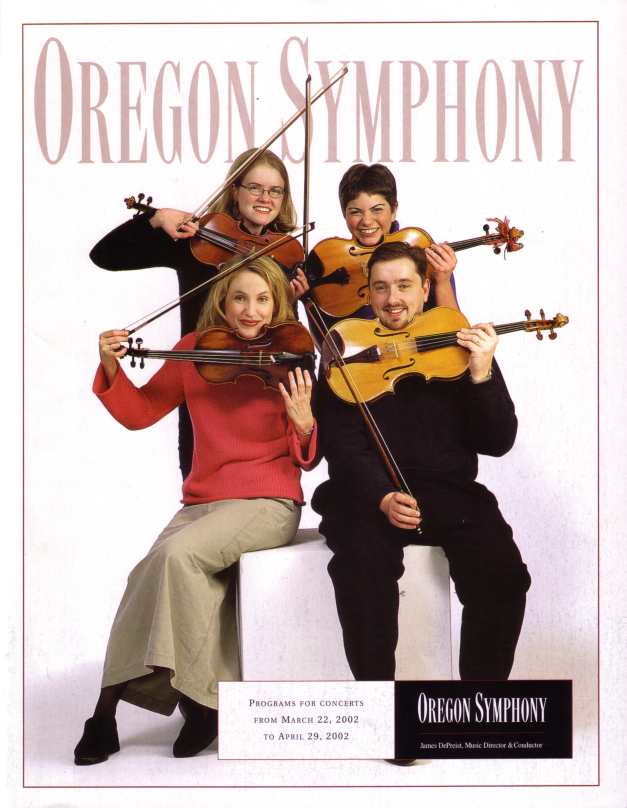 I was doing some more scrounging around in my files and found this OSO program cover from March/April 2002. The OSO was doing a series of profiles on musicians and their work with students. Denise Huizenga (at lower left) was in the Ethos Quartet with me at the time, so they did our profiles concurrently. My featured student (at top left) was Caitlin Lynch, who just got back from a semester at the Paris Conservatory and is a senior at the Cleveland Institute of Music, where she studies with Jeffrey Irvine. A delight both now and then. [Click on the thumbnail for a larger view.]